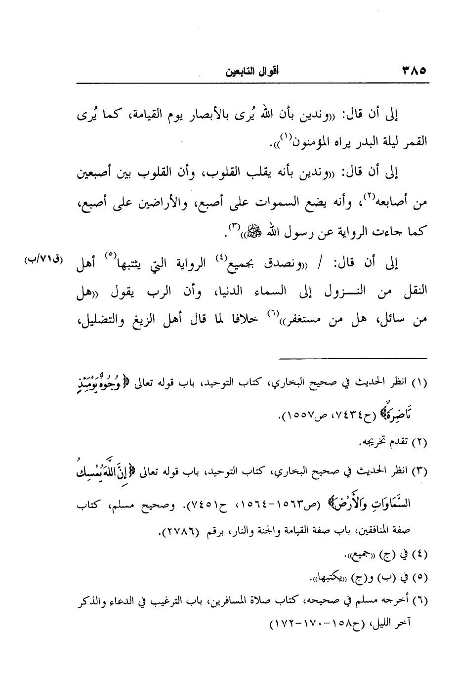 إلى أن قال: (ق71/ب) "ونصدق بجميع4 الرواية التي يثتبها5 أهل النقل من النزول إلى السماء الدنيا، وأن الرب يقول "هل من سائل، هل من مستغفر" 6 خلافا لما قال أهل الزيغ والتضليل،