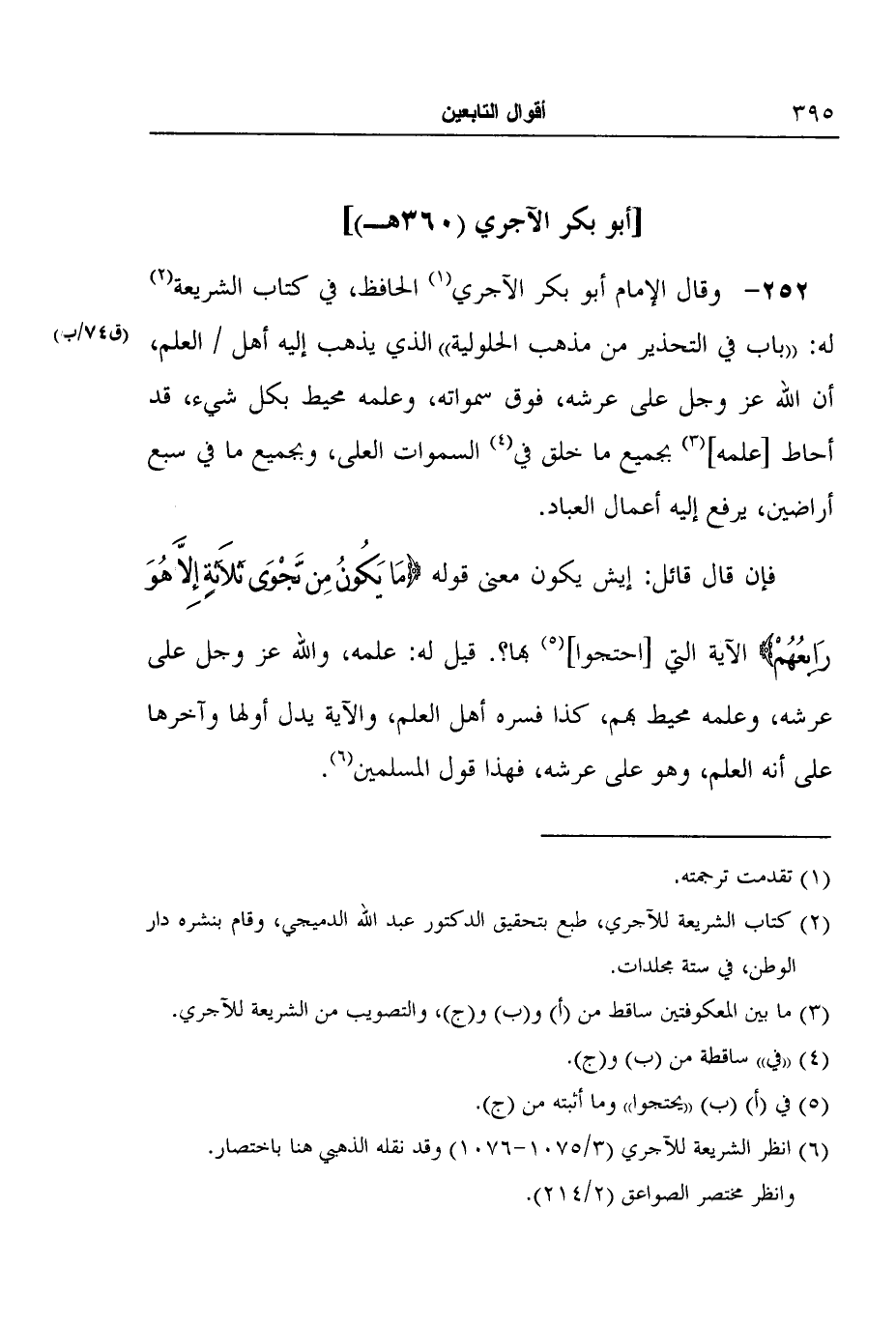 6 انظر الشريعة للآجري (3/1075-1076) وقد نقله الذهبي هنا باختصار. وانظر مختصر الصواعق (2/214) .