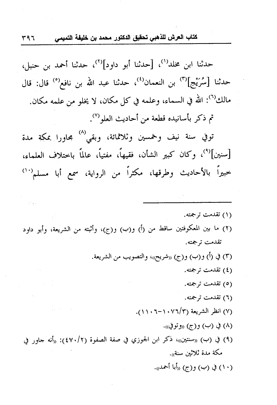 حدثنا ابن مخلد1، [حدثنا أبو داود] 2، حدثنا أحمد بن حنبل، حدثنا [سُرَيْج] 3 بن النعمان4، حدثنا عبد الله بن نافع5 قال: قال مالك6: الله في السماء، وعلمه في كل مكان، لا يخلو من علمه مكان.
