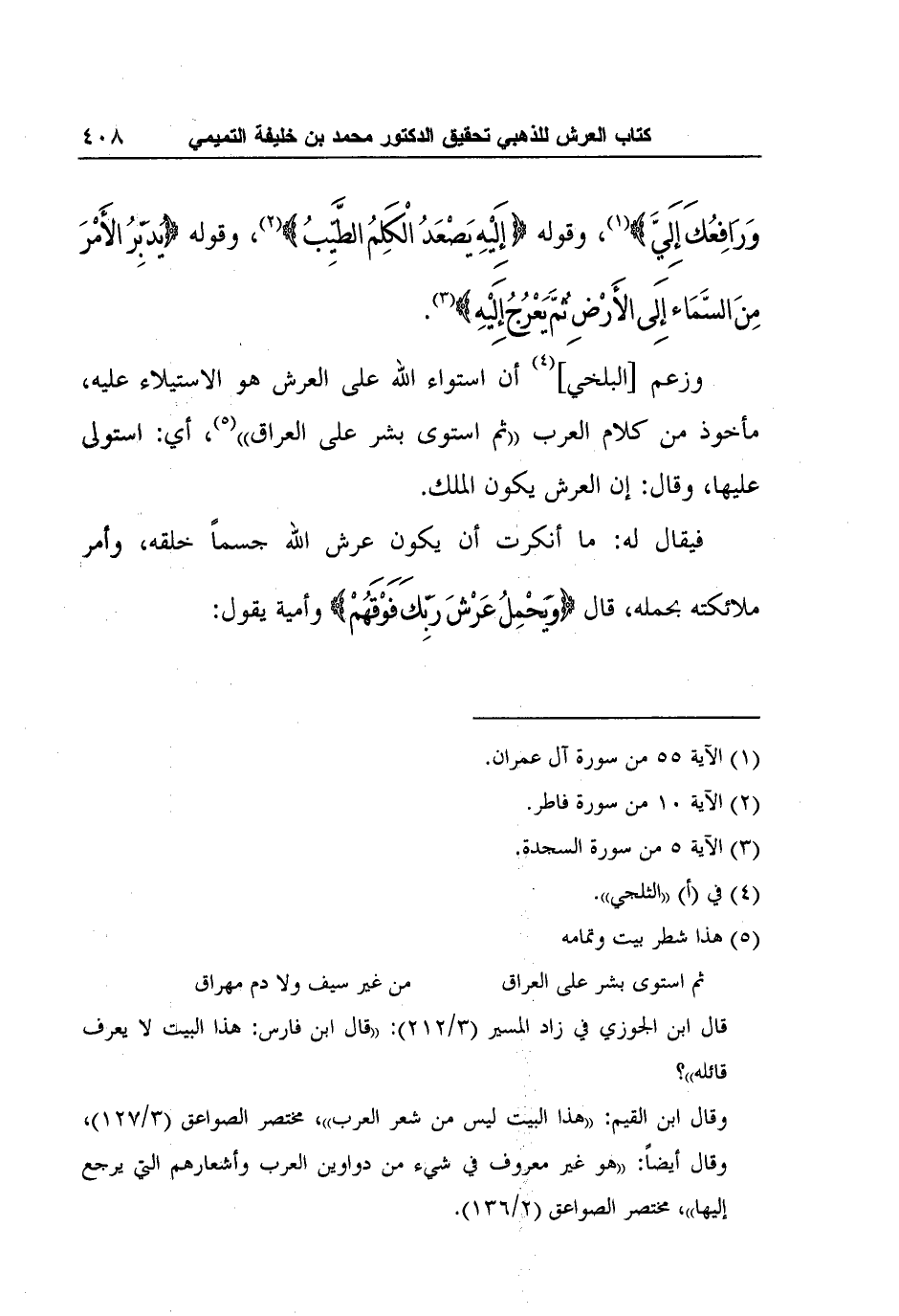 وزعم [البلخي] 4 أن استواء الله على العرش هو الاستيلاء عليه، مأخوذ من كلام العرب "ثم استوى بشر على العراق"5، أي: استولى عليها، وقال: إن العرش يكون الملك.