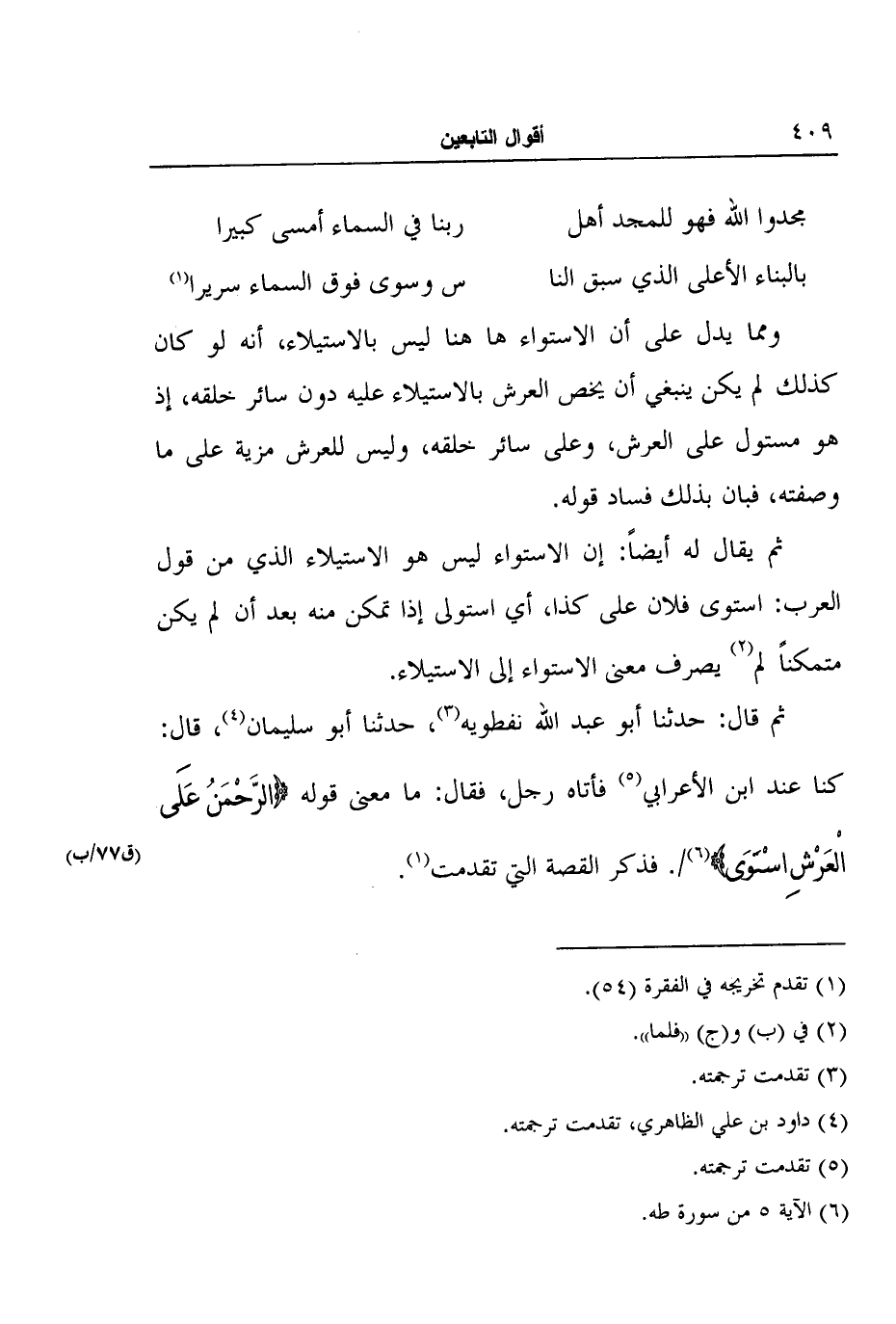 ثم قال: حدثنا أبو عبد الله نفطويه3، حدثنا أبو سليمان4، قال: كنا عند ابن الأعرابي5 فأتاه رجل، فقال: ما معنى قوله {الرَّحْمَنُ عَلَى الْعَرْشِ اسْتَوَى} 6 (ق77/ب) . فذكر القصة التي تقدمت7.