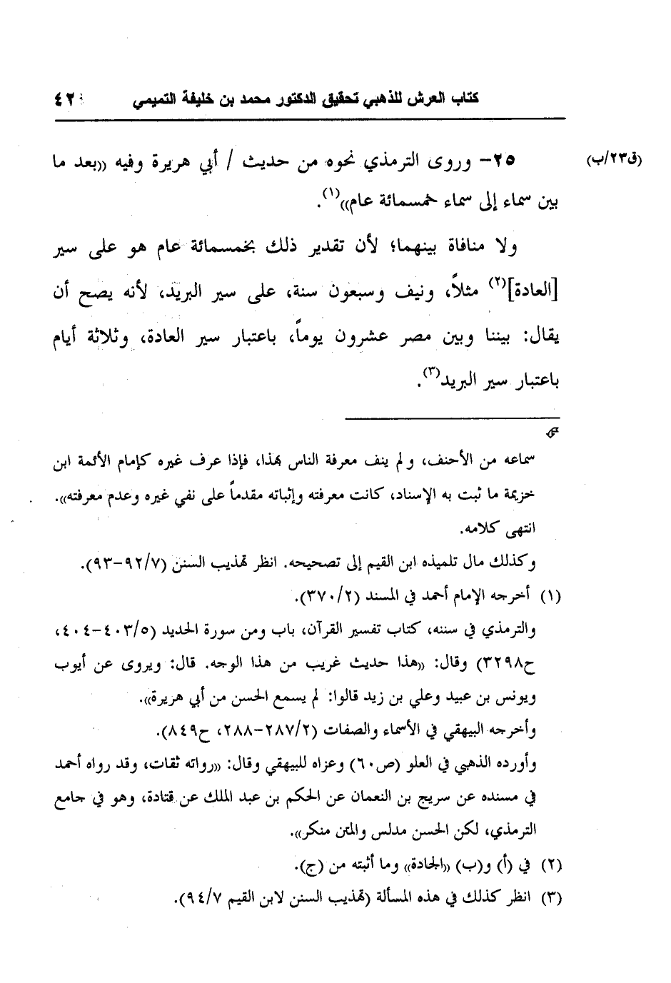 25- وروى الترمذي نحوه من حديث (ق23/ب) أبي هريرة وفيه "بعد ما بين سماء إلى سماء خمسمائة عام"1.