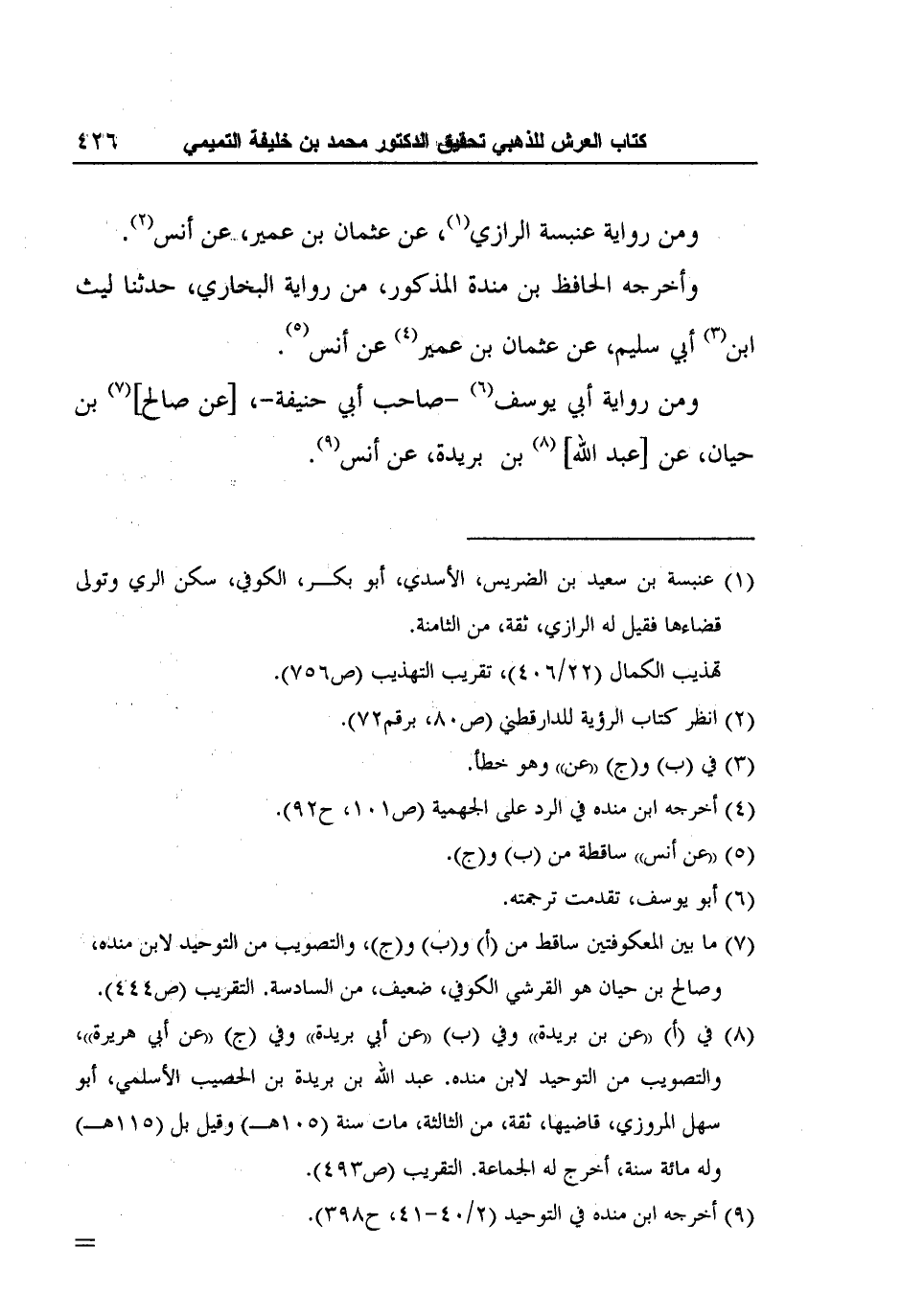 9 أخرجه ابن منده في التوحيد (2/40-41، ح398) ، وأورده الذهبي في العلو (ص29) وقال:"صالح ضعيف، تفرد به عن القاضي أبي يوسف".