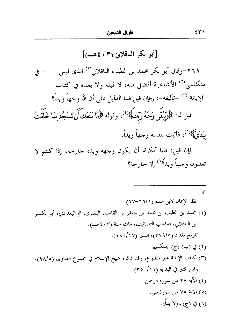 261- وقال أبو بكر محمد بن الطيب الباقلاني1 الذي ليس في متكلمي2 الأشاعرة أفضل منه، لا قبله ولا بعده في كتاب