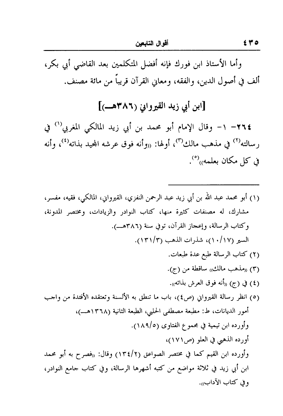 5 انظر رسالة القيرواني (ص4) ، باب ما تنطق به الألسنة وتعتقده الأفئدة من واجب أمور الديانات، ط: مطبعة مصطفى الحلبي، الطبعة الثانية (1368هـ) ، وأورده ابن تيمية في مجموع الفتاوى (5/189) . أورده الذهبي في العلو (ص171) ، وأورده ابن القيم كما في مختصر الصواعق (2/134) وقال: "فصرح به أبو محمد ابن أبي زيد في ثلاثة مواضع من كتبه أشهرها الرسالة، وفي كتاب جامع النوادر، وفي كتاب الآداب".