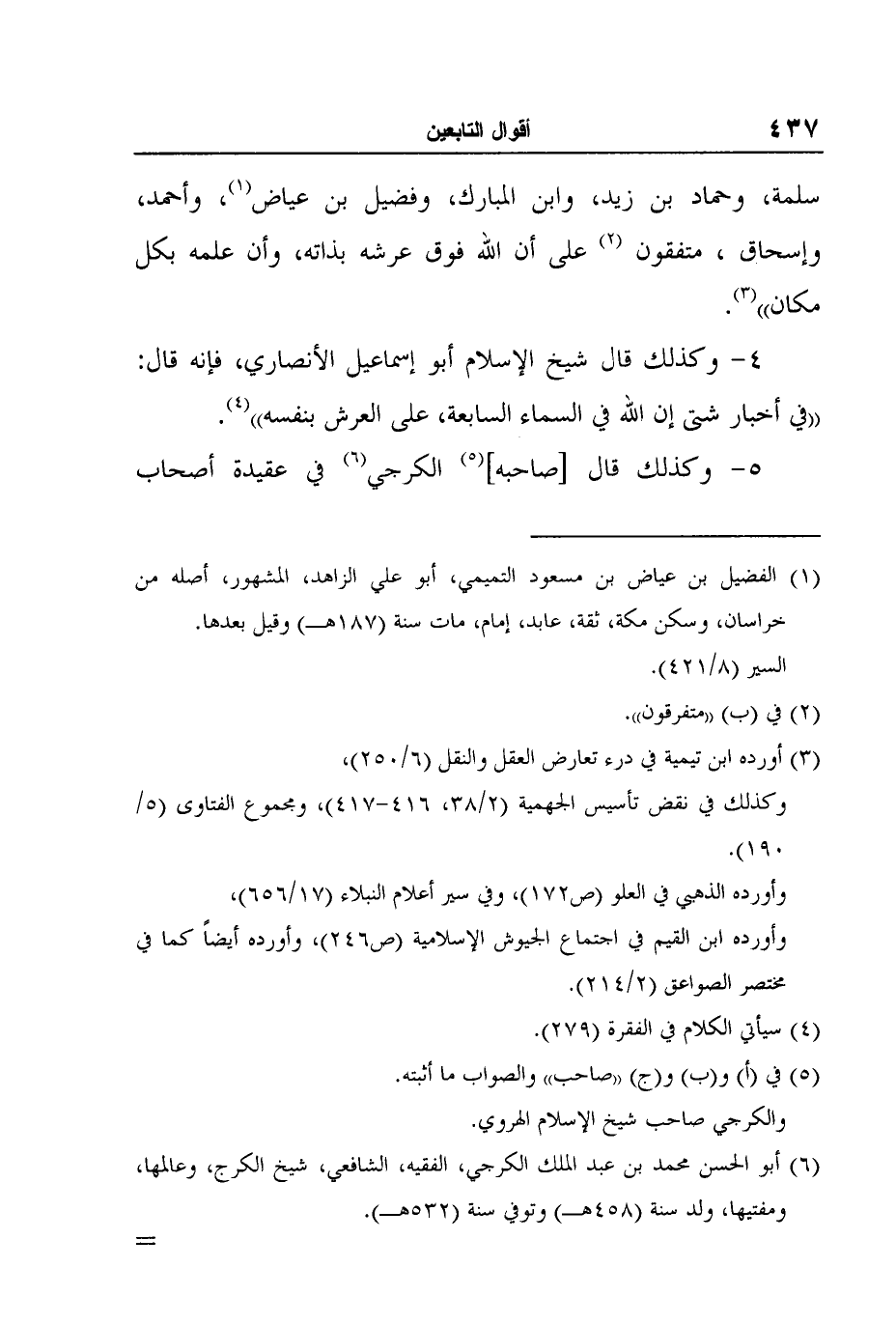 4- وكذلك قال شيخ الإسلام أبو إسماعيل الأنصاري، فإنه قال: "في أخبار شتى إن الله في السماء السابعة، على العرش بنفسه"4.