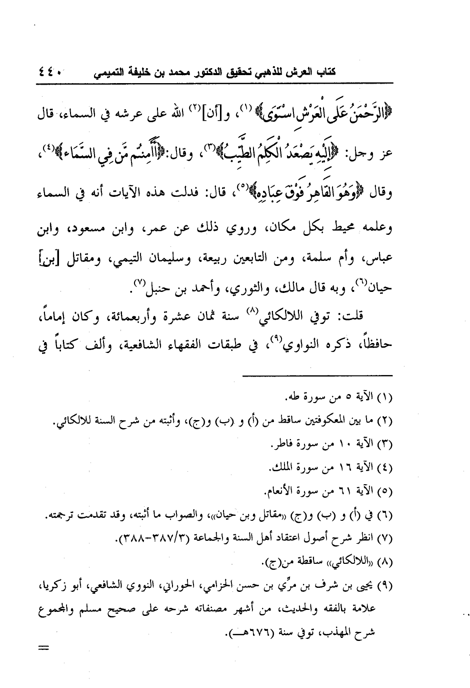 قلت: توفي اللالكائي8 سنة ثمان عشرة وأربعمائة، وكان إماماً، حافظاً، ذكره النواوي9، في طبقات الفقهاء الشافعية، وألف كتاباً في