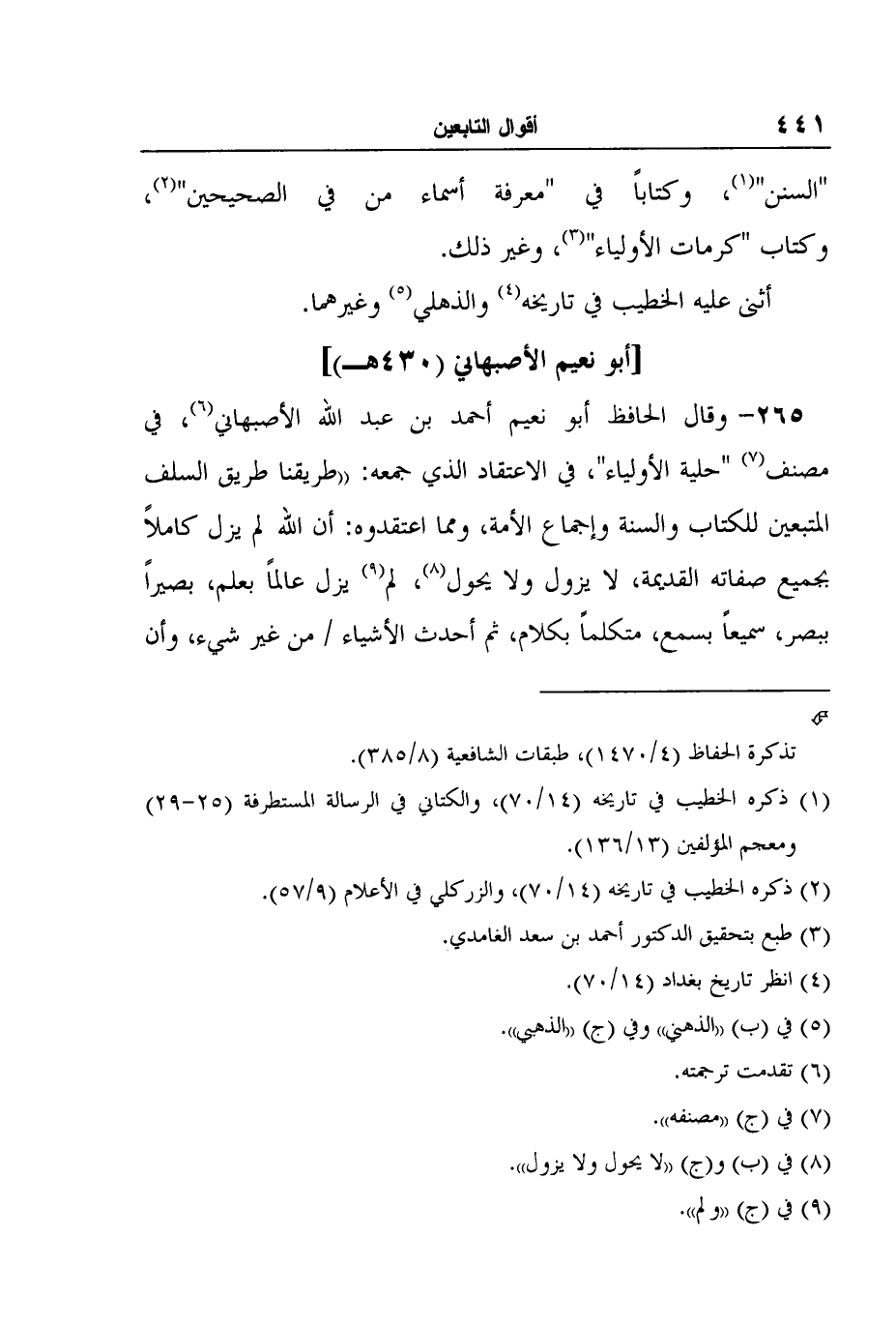 265- وقال الحافظ أبو نعيم أحمد بن عبد الله الأصبهاني6، في مصنف7 "حلية الأولياء"، في الاعتقاد الذي جمعه: "طريقنا طريق السلف المتبعين للكتاب والسنة وإجماع الأمة، ومما اعتقدوه: أن الله لم يزل كاملاً بجميع صفاته القديمة، لا يزول ولا يحول8، لم9 يزل عالماً بعلم، بصيراً ببصر، سميعاً بسمع، متكلماً بكلام، ثم أحدث الأشياء (ق83/ب) من غير شيء، وأن