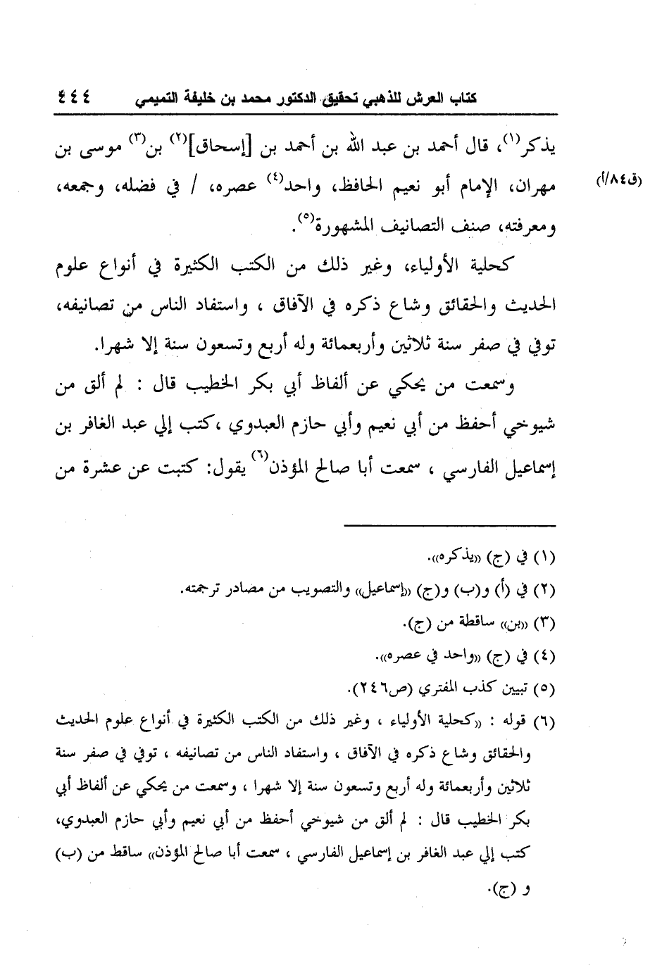 6 قوله: "كحلية الأولياء، وغير ذلك من الكتب الكثيرة في أنواع علوم الحديث والحقائق وشاع ذكره في الآفاق، واستفاد الناس من تصانيفه، توفي في صفر سنة ثلاثين وأربعمائة وله أربع وتسعون سنة إلا شهرا، وسمعت من يحكي عن ألفاظ أبي بكر الخطيب قال: لم ألق من شيوخي أحفظ من أبي نعيم وأبي حازم العبدوي، كتب إلي عبد الغافر بن إسماعيل الفارسي، سمعت أبا صالح المؤذن" ساقط من (ب) و (ج) .