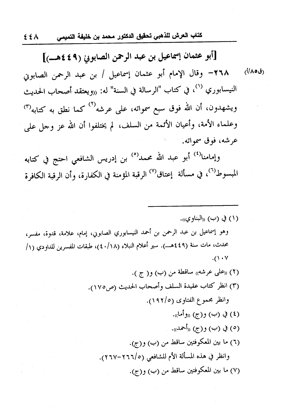 268- وقال الإمام أبو عثمان إسماعيل (ق85/أ) بن عبد الرحمن الصابوني النيسابوري 1، في كتاب "الرسالة في السنة" له: "ويعتقد أصحاب الحديث ويشهدون، أن الله فوق سبع سمواته، على عرشه2 كما نطق به كتابه3 وعلماء الأمة، وأعيان الأئمة من السلف، لم يختلفوا أن الله عز وجل على عرشه، فوق سمواته.