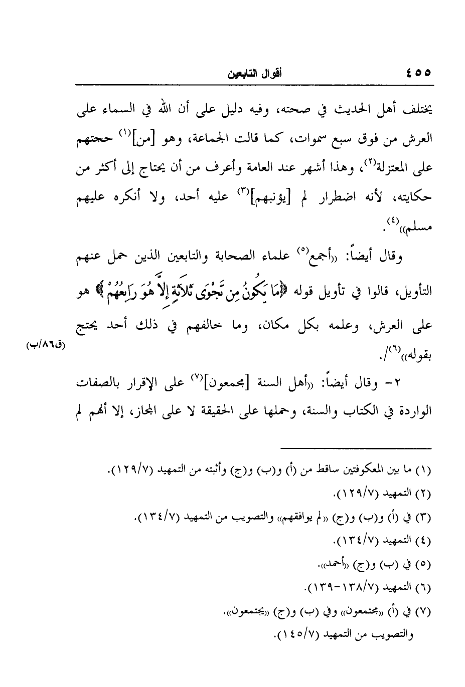 وقال أيضاً: "أجمع5 علماء الصحابة والتابعين الذين حمل عنهم التأويل، قالوا في تأويل قوله {مَا يَكُونُ مِن نَّجْوَى ثَلاَثَةٍ إِلاَّ هُوَ رَابِعُهُمْ} هو على العرش، وعلمه بكل مكان، وما خالفهم في ذلك أحد يحتج بقوله"6 (ق86/ب) .