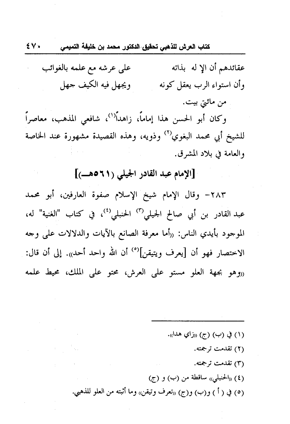283- وقال الإمام شيخ الإسلام صفوة العارفين، أبو محمد عبد القادر بن أبي صالح الجيلي3 الحنبلي4، في كتاب "الغنية" له، الموجود بأيدي الناس: "أما معرفة الصانع بالآيات والدلالات على وجه الاختصار فهو أن [يعرف ويتيقن] 5 أن الله واحد أحد". إلى أن قال: "وهو بجهة العلو مستو على العرش، محتو على الملك، محيط علمه