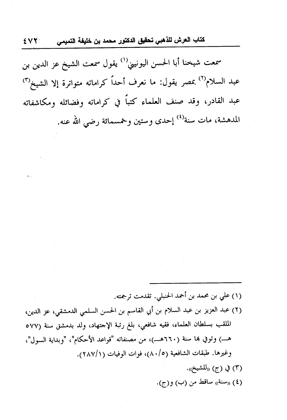 2 عبد العزيز بن عبد السلام بن أبي القاسم بن الحسن السلمي الدمشقي، عز الدين، الملقب بسلطان العلماء، فقيه شافعي، بلغ رتبة الإجتهاد، ولد بدمشق سنة (577هـ) وتوفي بها سنة (660هـ) ، من مصنفاته "قواعد الأحكام"، "وبداية السول"، وغيرها. طبقات الشافعية (5/80) ، فوات الوفيات (1/287) .
