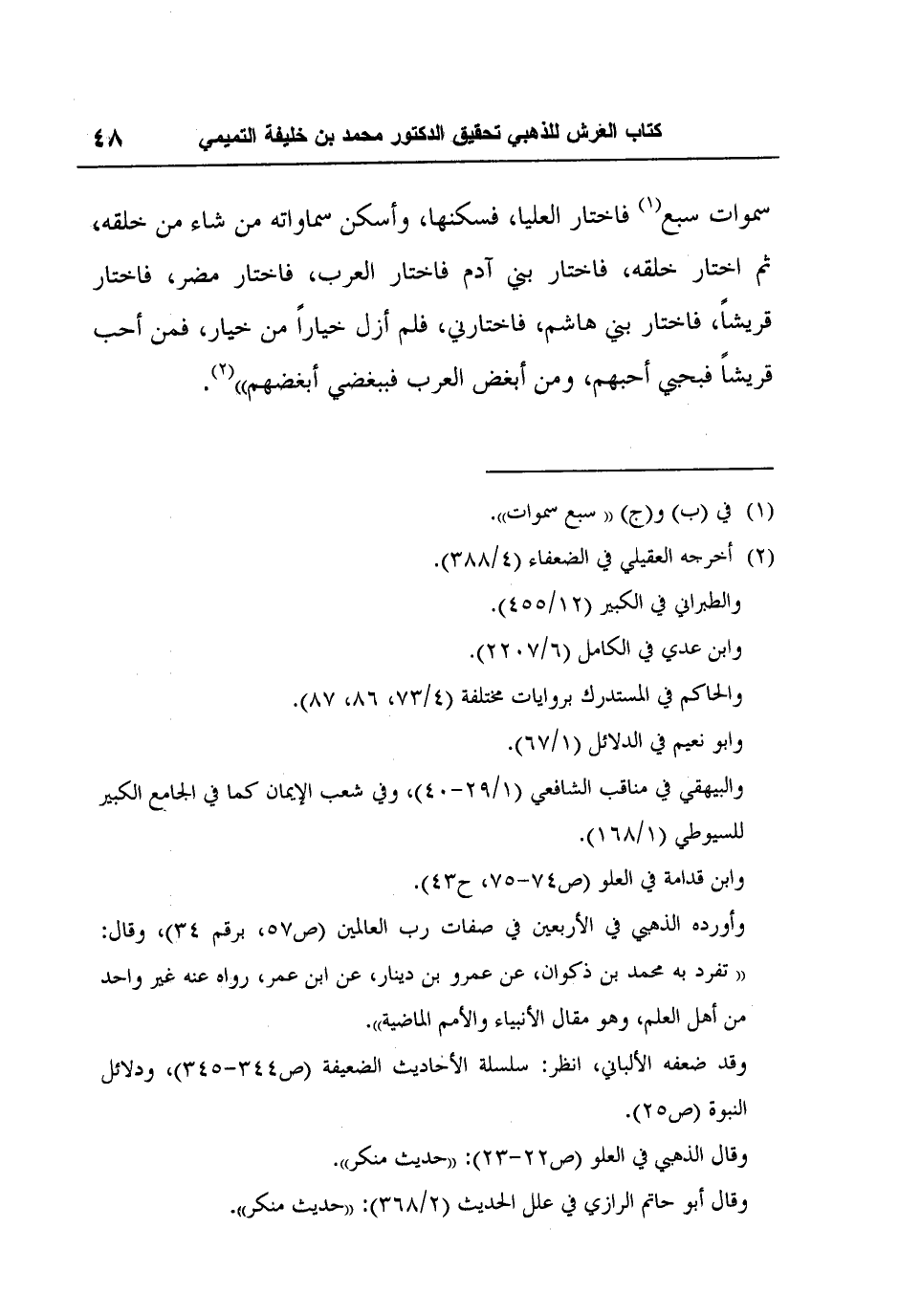 2 أخرجه العقيلي في الضعفاء (4/388) .والطبراني في الكبير (12/455) .وابن عدي في الكامل (6/2207) .والحاكم في المستدرك بروايات مختلفة (4/73، 86، 87) .وابو نعيم في الدلائل (1/67) .والبيهقي في مناقب الشافعي (1/29-40) ، وفي شعب الإيمان كما في الجامع الكبير للسيوطي (1/168) .وابن قدامة في العلو (ص74-75، ح43) .وأورده الذهبي في الأربعين في صفات رب العالمين (ص57، برقم 34) ، وقال: "تفرد به محمد بن ذكوان، عن عمرو بن دينار، عن ابن عمر، رواه عنه غير واحد من أهل العلم، وهو مقال الأنبياء والأمم الماضية".وقد ضعفه الألباني، انظر: سلسلة الأحاديث الضعيفة (ص344-345) ، ودلائل النبوة (ص25) .وقال الذهبي في العلو (ص22-23) : "حديث منكر".وقال أبو حاتم الرازي في علل الحديث (2/368) : "حديث منكر".