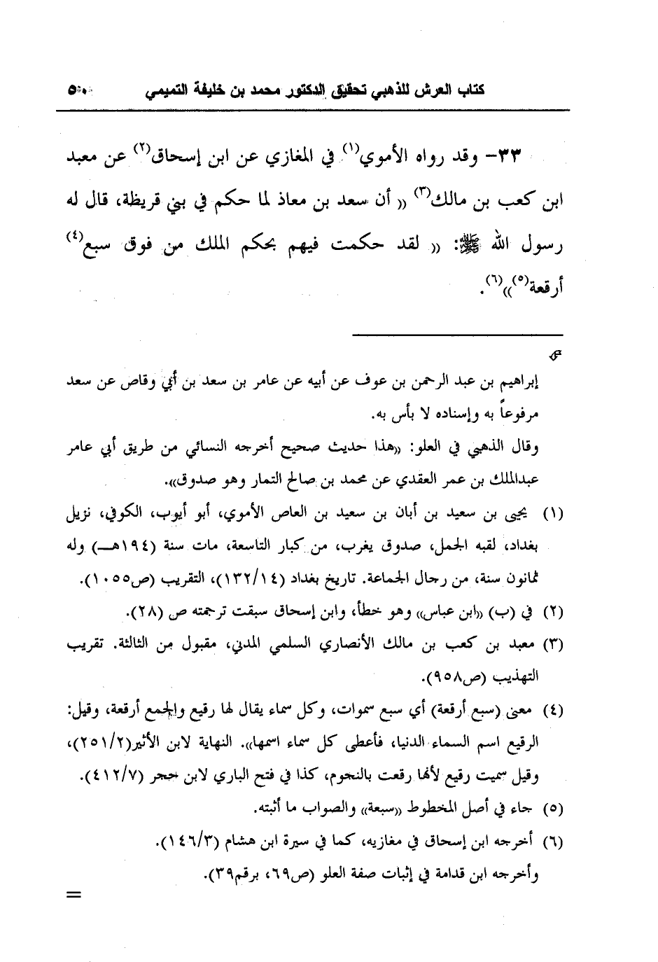 33- وقد رواه الأموي1 في المغازي عن ابن إسحاق2 عن معبد ابن كعب بن مالك3 " أن سعد بن معاذ لما حكم في بني قريظة، قال له رسول الله صلى الله عليه وسلم: "لقد حكمت فيهم بحكم الملك من فوق سبع4 أرقعة5"6.