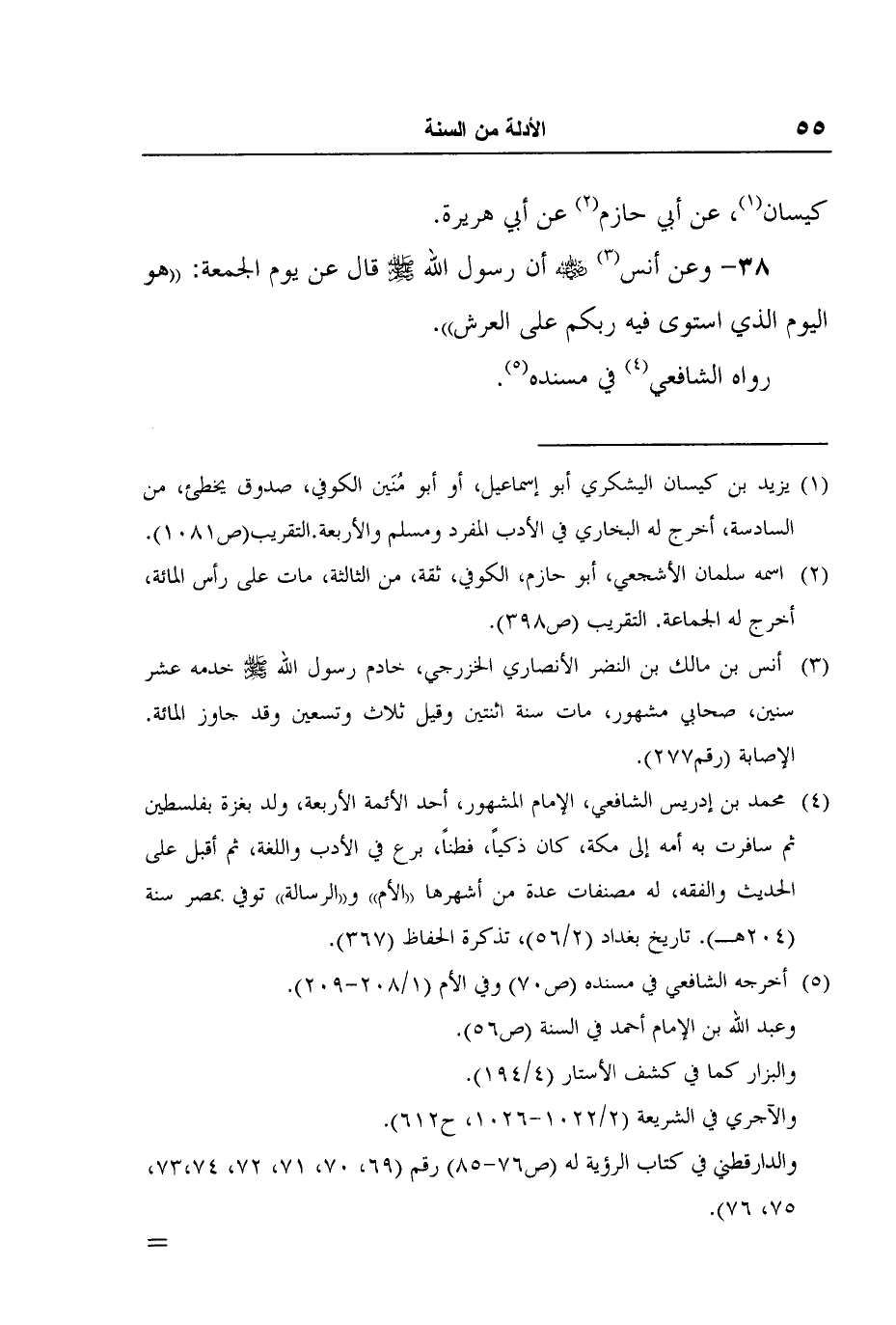 38- وعن أنس3 رضي الله عنه أن رسول الله صلى الله عليه وسلم قال عن يوم الجمعة: "هو اليوم الذي استوى فيه ربكم على العرش".