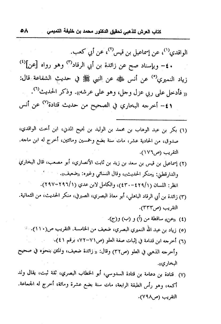 6 أخرجه ابن قدامة في إثبات صفة العلو (ص71-72، برقم 41) .وأخرجه الذهبي في العلو (ص32) وقال: " زائدة ضعيف، والمتن بنحوه في صحيح البخاري".