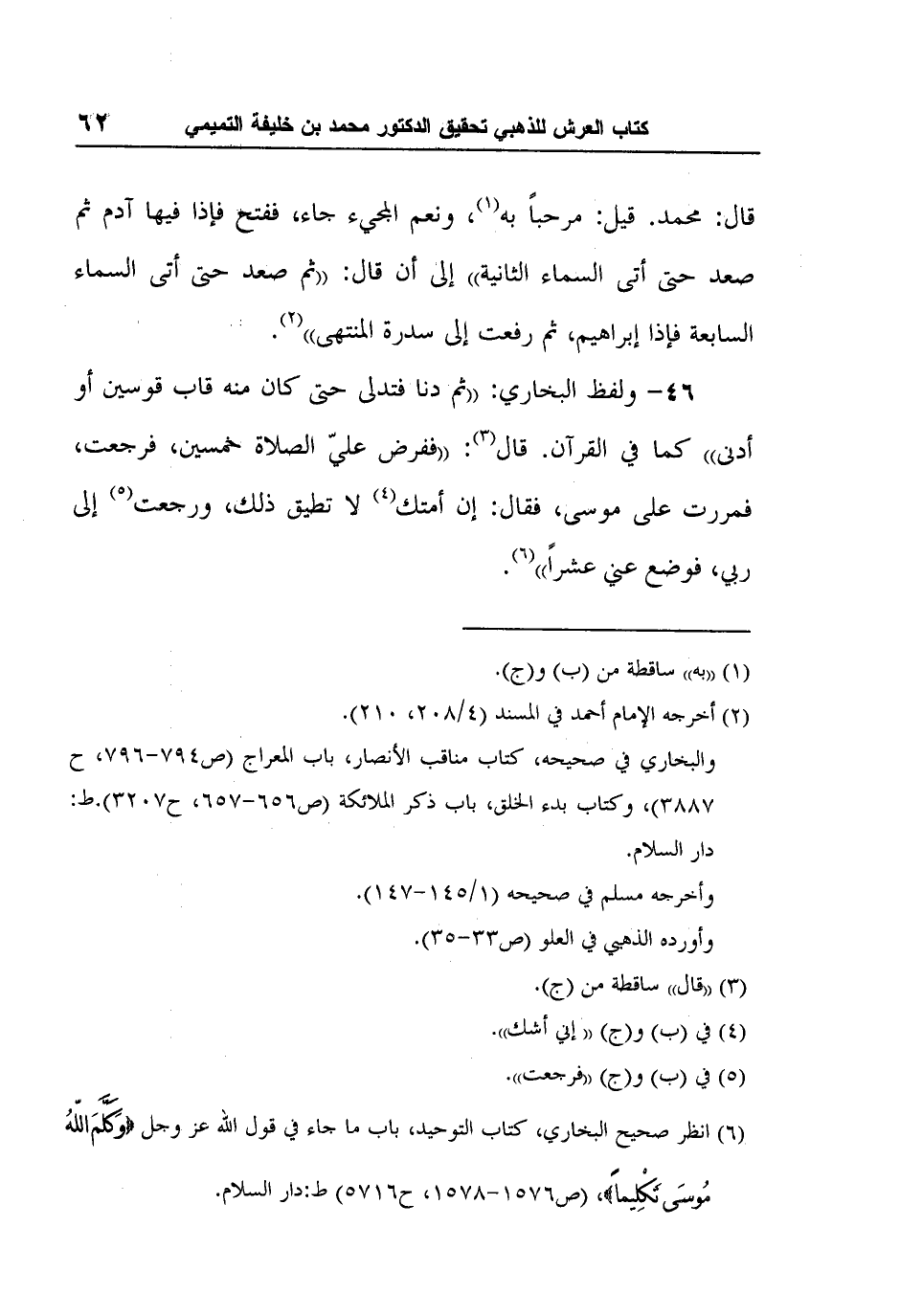 6 انظر صحيح البخاري، كتاب التوحيد، باب ما جاء في قول الله عز وجل {وَكَلَّمَ اللهُ مُوسَى تَكْلِيماً} ، (ص1576-1578، ح5716) ط: دار السلام.