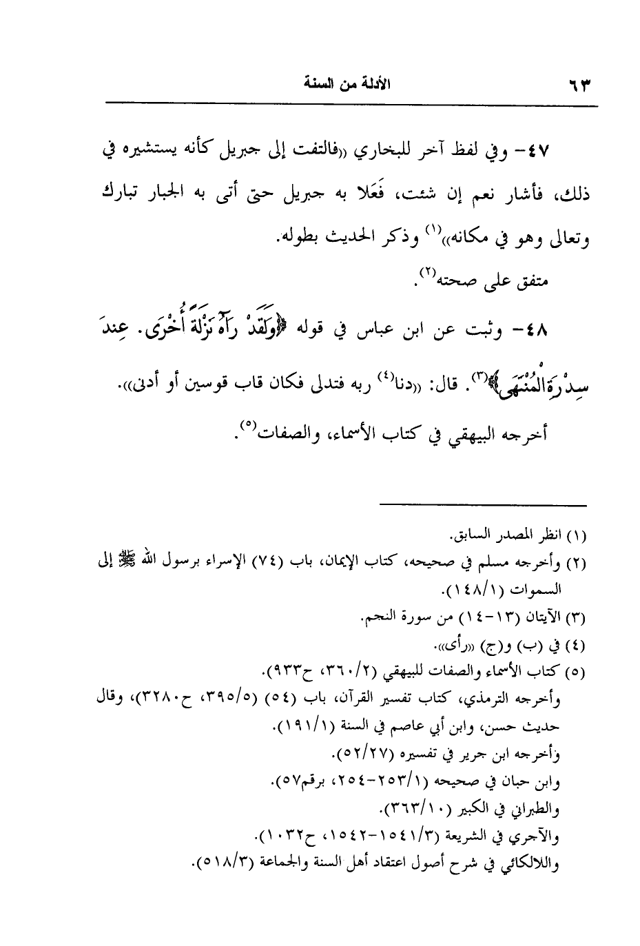 48- وثبت عن ابن عباس في قوله {وَلَقَدْ رَآهُ نَزْلَةً أُخْرَى. عِندَ سِدْرَةِ الْمُنْتَهَى} 3. قال: "دنا4 ربه فتدلى فكان قاب قوسين أو أدنى".