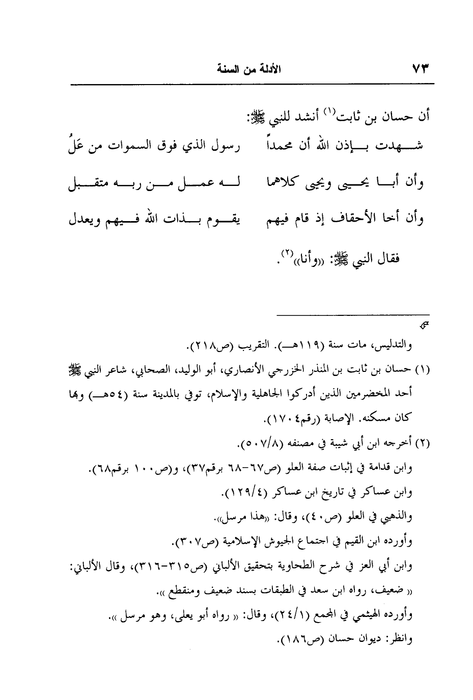 2 أخرجه ابن أبي شيبة في مصنفه (8/507) .وابن قدامة في إثبات صفة العلو (ص67-68 برقم37) ، و (ص100 برقم68) . وابن عساكر في تاريخ ابن عساكر (4/129) .والذهبي في العلو (ص40) ، وقال: "هذا مرسل".وأورده ابن القيم في اجتماع الجيوش الإسلامية (ص307) .وابن أبي العز في شرح الطحاوية بتحقيق الألباني (ص315-316) ، وقال الألباني: " ضعيف، رواه ابن سعد في الطبقات بسند ضعيف ومنقطع ".وأورده الهيثمي في المجمع (1/24) ، وقال: " رواه أبو يعلى، وهو مرسل ".وانظر: ديوان حسان (ص186) .
