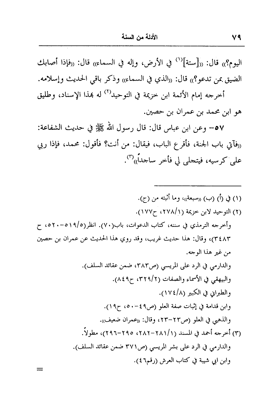 3 أخرجه أحمد في المسند (1/281-282، 295-296) ، مطولاً. والدارمي في الرد على بشر المريسي (ص371 ضمن عقائد السلف) .وابن ابي شيبة في كتاب العرش (رقم46) .جميعهم من طريق حماد بن سلمة، عن علي بن زيد، عن أبي نضرة، عن ابن عباس مرفوعاً. ورجاله ثقات إلى علي بن زيد ففيه ضعف، ولكن الحديث له شواهد ذكرتها في تعليقي على كتاب العرش لابن أبي شيبة.