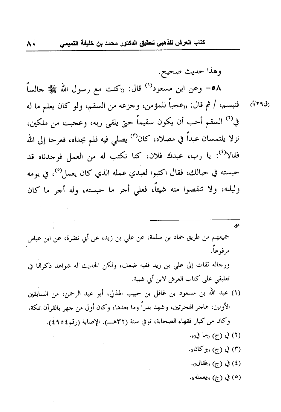 58- وعن ابن مسعود1 قال: "كنت مع رسول الله صلى الله عليه وسلم جالساً فتبسم، (ق29/أ) ثم قال: "عجباً للمؤمن، وجزعه من السقم، ولو كان يعلم ما له في2 السقم أحب أن يكون سقيماً حتى يلقى ربه، وعجبت من ملكين، نزلا يلتمسان عبداً في مصلاه، كان3 يصلي فيه فلم يجداه، فعرجا إلى الله فقالا4: يا رب، عبدك فلان، كنا نكتب له من العمل فوجدناه قد حبسته في حبالك، فقال اكتبوا لعبدي عمله الذي كان يعمل5، في يومه وليلته، ولا تنقصوا منه شيئاً، فعلي أجر ما حبسته، وله أجر ما كان