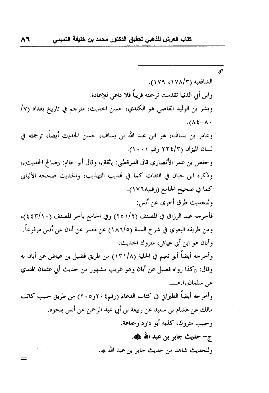 الشافعية (3/178، 179) .وابن أبي الدنيا تقدمت ترجمته قريباً فلا داعي للإعادة. وبشر بن الوليد القاضي هو الكندي، حسن الحديث، مترجم في تاريخ بغداد (7/80-84) .وعامر بن يساف، هو ابن عبد الله بن يساف، حسن الحديث أيضاً، ترجمته في لسان الميزان (3/224 رقم 1001) .وحفص بن عمر الأنصاري قال الدرقطني: "ثقة"، وقال أبو حاتم: "صالح الحديث"، وذكره ابن حبان في الثقات كما في تهذيب التهذيب، والحديث صححه الألباني كما في صحيح الجامع (رقم1768) .وللحديث طرق أخرى عن أنس: فأخرجه عبد الرزاق في المصنف (2/251) وفي الجامع بآخر المصنف (10/443) ، ومن طريقه البغوي في شرح السنة (5/186) عن معمر عن أبان عن أنس مرفوعاً. وأبان هو ابن أبي عياش، متروك الحديث. وأخرجه أيضاً أبو نعيم في الحلية (8/131) من طريق فضيل بن عياض عن أبان به وقال: "كذا رواه فضيل عن أبان وهو غريب مشهور من حديث أبي عثمان الهندي عن سلمان" ا. هـ. وأخرجه أيضاً الطبراني في كتاب الدعاء (رقم204و205) من طريق حبيب كاتب مالك عن هشام بن سعيد عن ربيعة بن أبي عبد الرحمن عن أنس بنحوه. وحبيب متروك، كذبه أبو داود وجماعة.