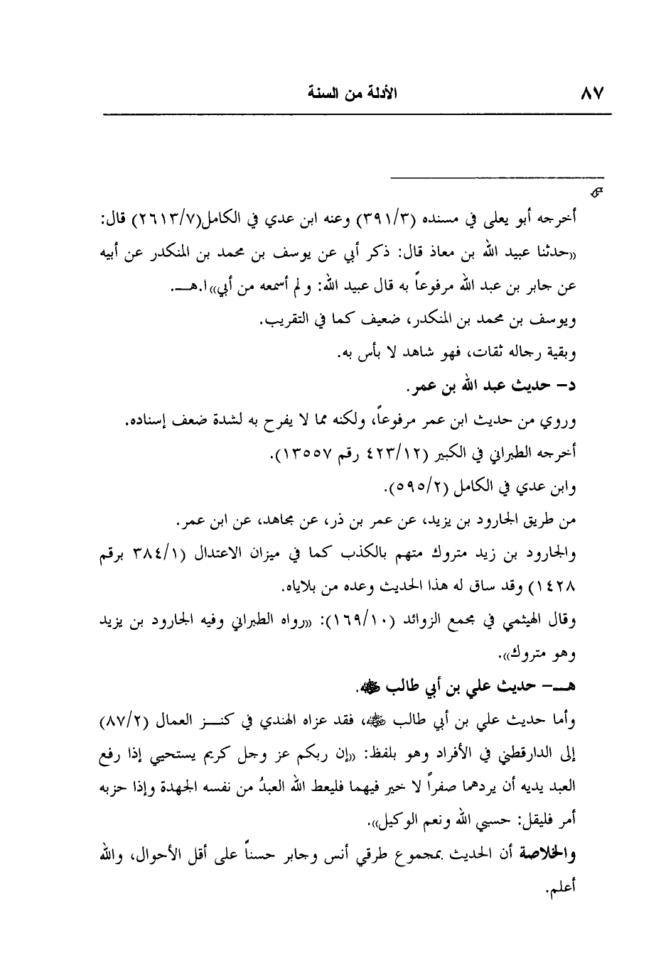 وأما حديث علي بن أبي طالب رضى الله عنه، فقد عزاه الهندي في كنز العمال (2/87) إلى الدارقطني في الأفراد وهو بلفظ: "إن ربكم عز وجل كريم يستحيي إذا رفع العبد يديه أن يردهما صفراً لا خير فيهما فليعط الله العبدُ من نفسه الجهدة وإذا حزبه أمر فليقل: حسبي الله ونعم الوكيل".