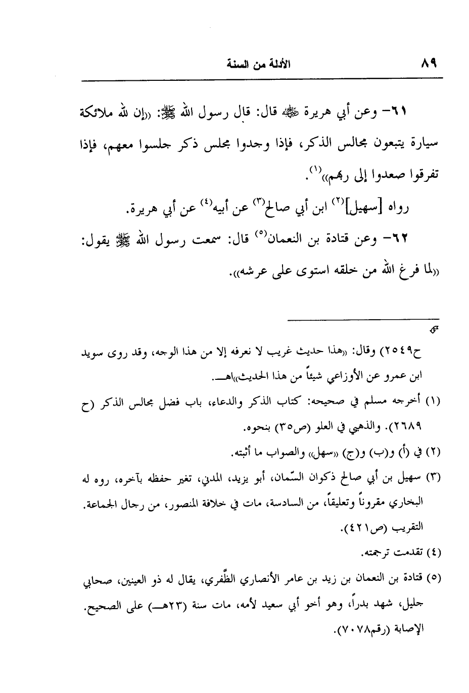 62- وعن قتادة بن النعمان5 قال: سمعت رسول الله صلى الله عليه وسلم يقول: "لما فرغ الله من خلقه استوى على عرشه".
