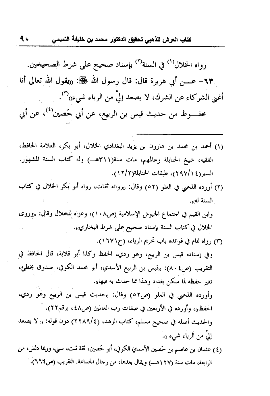 (3 (رواه تمام في فوائده باب تحريم الرياء، (ح1671) .وفي إسناده قيس بن الربيع، وهو رديء الحفظ وكذا أبو قلابة، قال الحافظ في التقريب (ص804) : "قيس بن الربيع الأسدي، أبو محمد الكوفي، صدوق يخطئ، تغير حفظه لما سكن بغداد وهذا مما حدث به فيها".وأورده الذهبي في العلو (ص52) وقال: "حديث قيس بن الربيع وهو رديء الحفظ"، وأورده في الأربعين في صفات رب العالمين (ص48، برقم22) .والحديث أصله في صحيح مسلم، كتاب الزهد، (4/2289) دون قوله: " لا يصعد إليَّ من الرياء شيء ".