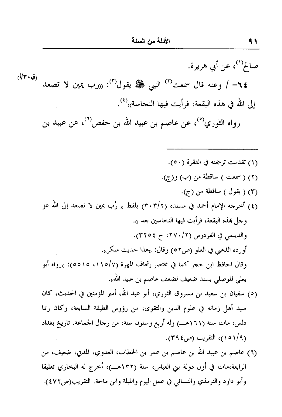 صالح1، عن أبي هريرة. (ق30/أ) 64- وعنه قال سمعت2 النبي صلى الله عليه وسلم يقول3: "رب يمين لا تصعد إلى الله في هذه البقعة، فرأيت فيها النجاسة"4.