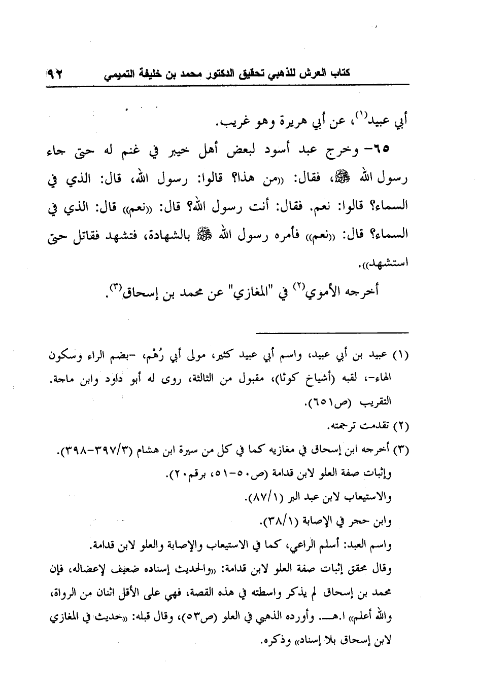 وإثبات صفة العلو لابن قدامة (ص50-51، برقم20) .والاستيعاب لابن عبد البر (1/87) .وابن حجر في الإصابة (1/38) .واسم العبد: أسلم الراعي، كما في الاستيعاب والإصابة والعلو لابن قدامة. وقال محقق إثبات صفة العلو لابن قدامة: "والحديث إسناده ضعيف لإعضاله، فإن محمد بن إسحاق لم يذكر واسطته في هذه القصة، فهي على الأقل اثنان من الرواة، والله أعلم" ا. هـ. وأورده الذهبي في العلو (ص53) ، وقال قبله: "حديث في المغازي لابن إسحاق بلا إسناد" وذكره.