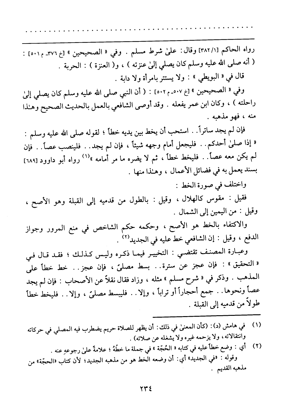 والاكتفاء بالخط هو الأصح، وحكمه حكم الشاخص في منع المرور وجواز الدفع، وقيل: إن الشافعي خط عليه في الجديد.