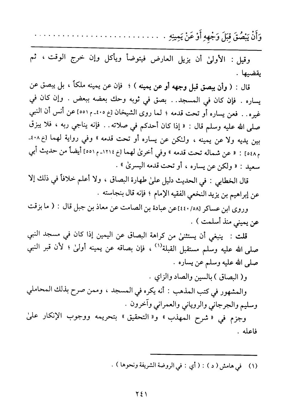 وَأَنْ يَبْصُقَ قِبَلَ وَجْهِهِ أَوْ عَنْ يَمِينِهِ