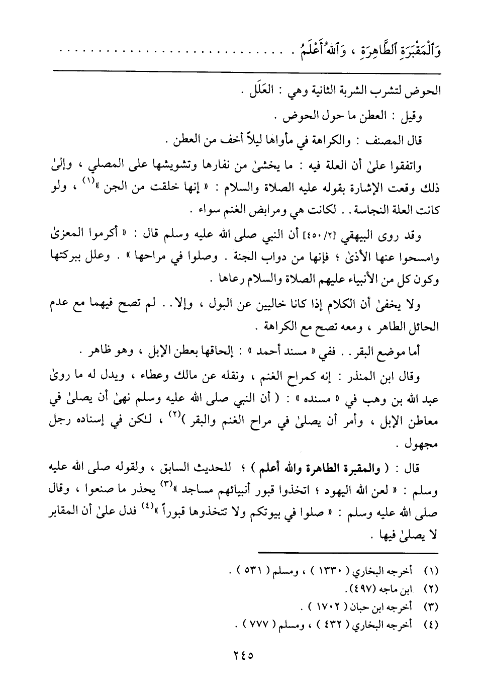 واتفقوا على أن العلة فيه: ما يخشى من نفارها وتشويشها على المصلي، وإلى ذلك وقعت الإشارة بقوله عليه الصلاة والسلام: (إنها خلقت من الجن)، ولو كانت العلة النجاسة .. لكانت هي ومرابض الغنم سواء.