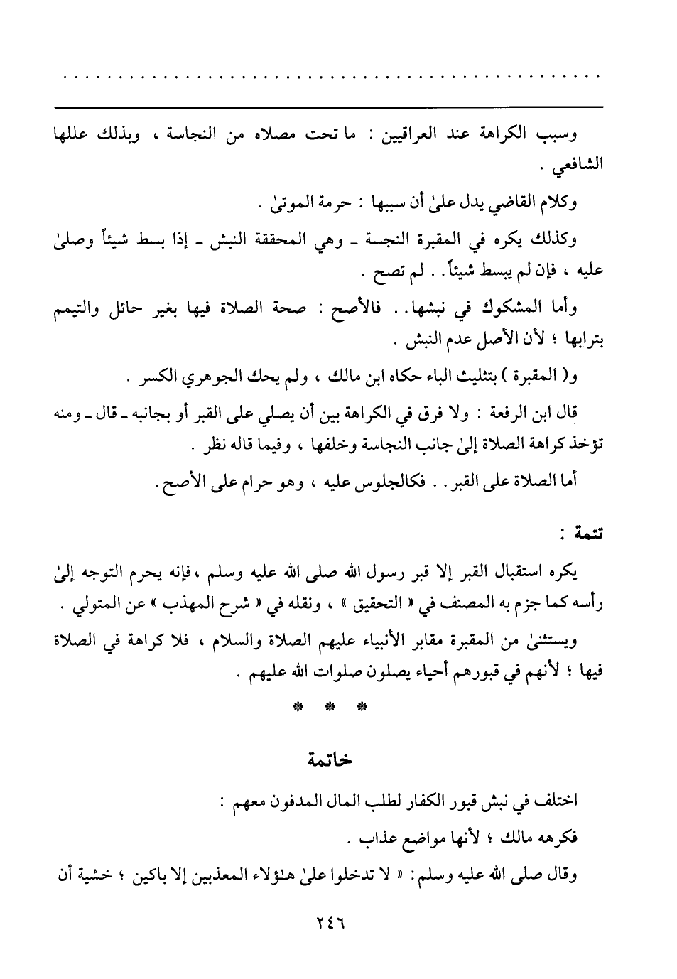 يكره استقبال القبر إلا قبر رسول الله صلى الله عليه وسلم، فإنه يحرم التوجه إلى رأسه كما جزم به المصنف في (التحقيق)، ونقله في (شرح المهذب) عن المتولي.