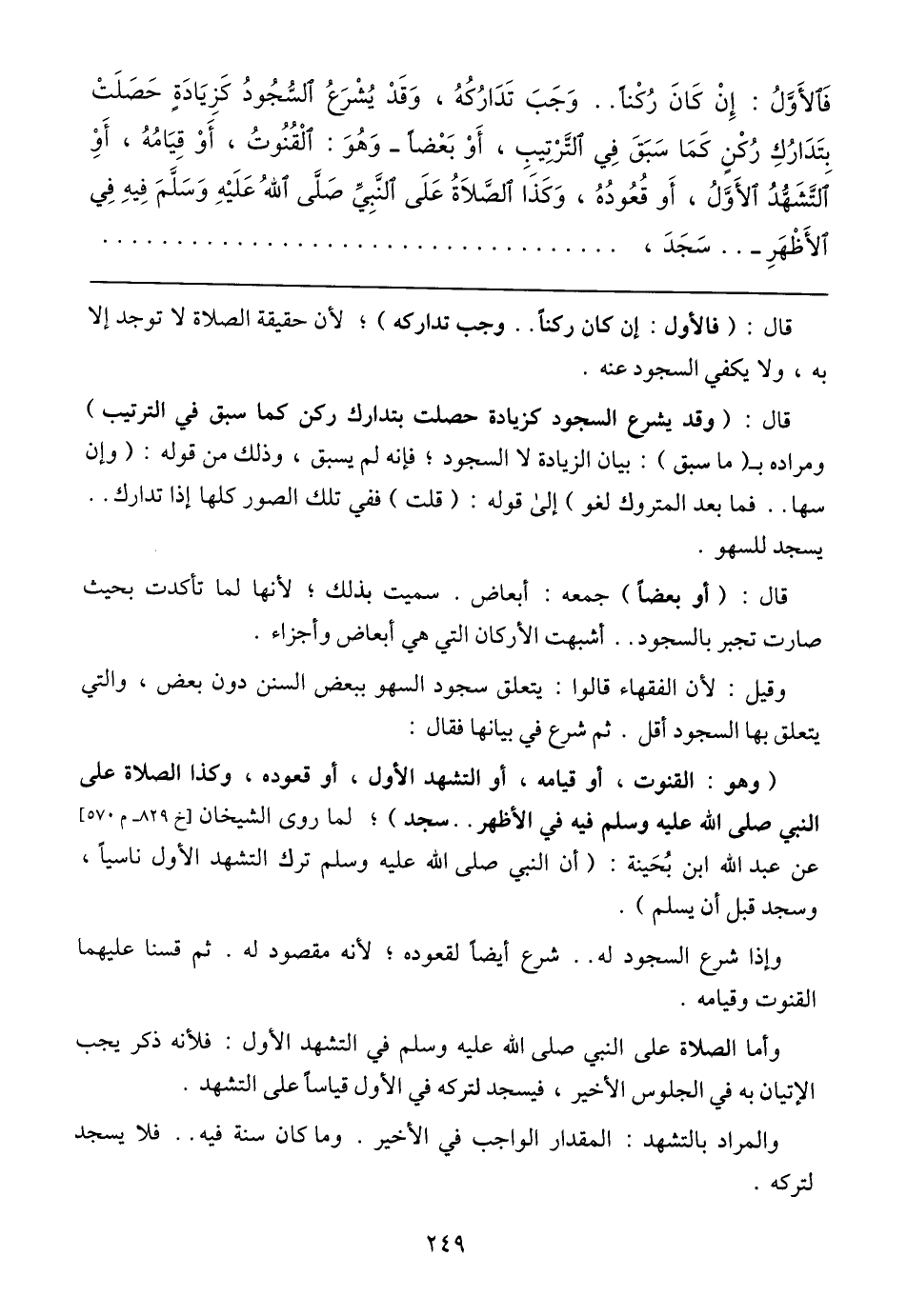 فَالأَوَّلُ: إِنْ كَانَ رُكْنًا .. وَجَبَ تَدَارُكُهُ، وَقَدْ يُشْرَعُ السُّجُودُ كَزِيَادَةٍ حَصَلَتْ بِتَدَارُكِ رُكْنٍ كَمَا سَبَقَ فِي التَّرْتِيبِ، أَوْ بَعْضًا- وَهُوَ: الْقُنُوتُ، أَوْ قِيَامُهُ، أَوْ التَّشَهُّدُ الأَوَّلُ، أَو قُعُودُهُ، وَكَذَا الصَّلاَةُ عَلَى النَّبِيِّ صَلَّى اللهُ عَلَيْهِ وَسَلَّمَ فِيهِ فِي الأَظْهَرِ- .. سَجَدَ،