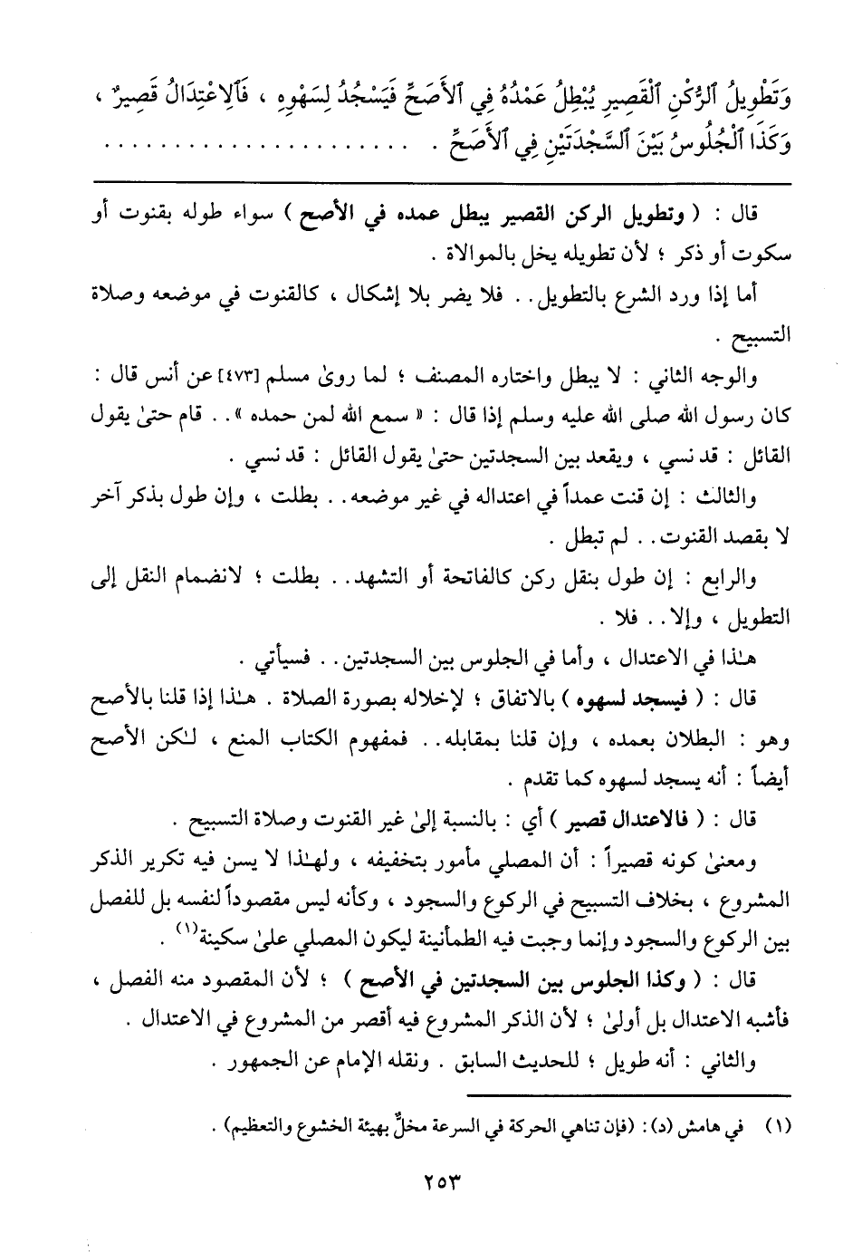 وَتَطْوِيلُ الرُّكْنِ الْقَصِيرِ يُبْطِلُ عَمْدُهُ فِي الأَصَحِّ فَيَسْجُدُ لِسَهْوِهِ، فَالاِعْتِدَالُ قَصِيرٌ، وَكَذَا الْجُلُوسُ بَيْنَ السَّجْدَتَيْنِ فِي الأَصَحِّ