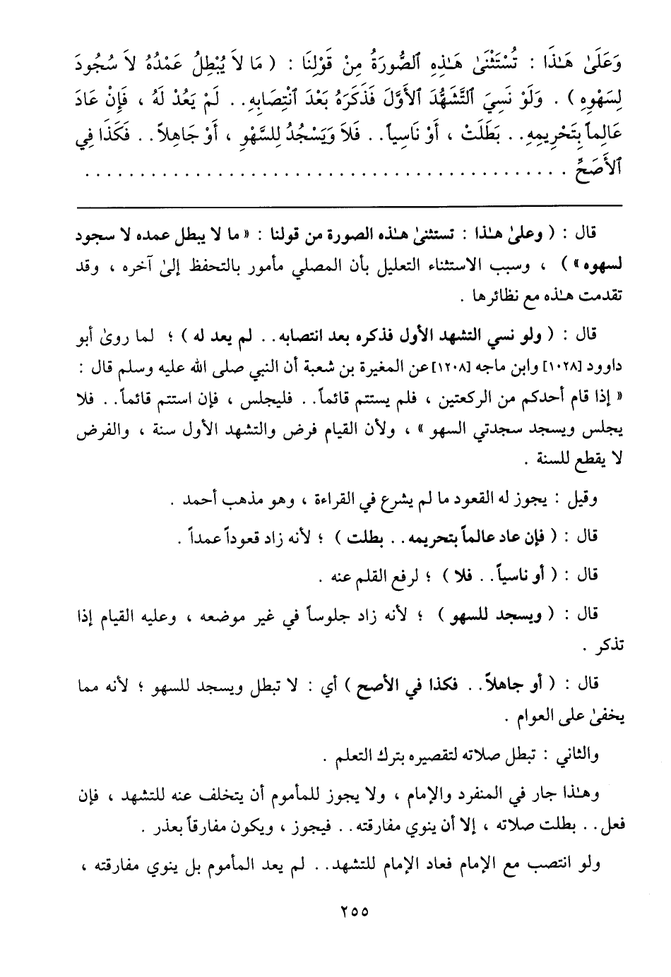 وَعَلَى هَذاَ: تُسْتَثْنَى هَذِهِ الصُّورَةُ مِنْ قَوْلِنَا: (مَا لاَ يُبْطِلُ عَمْدُهُ لاَ سُجُودَ لِسَهْوِهِ). وَلَوْ نَسِيَ التَّشَهُّدَ الأَوَّلَ فَذَكَرَهُ بَعْدَ انْتِصَابِهِ .. لَمْ يَعُدْ لَهُ، فَإِنْ عَادَ عَالِمًا بِتَحْرِيمِهِ .. بَطَلَتْ، أَوْ نَاسِيًا .. فَلاَ وَيَسْجُدُ لِلسَّهْوِ، أَوْ جَاهِلاً .. فَكَذَا فِي الأَصَحِّ