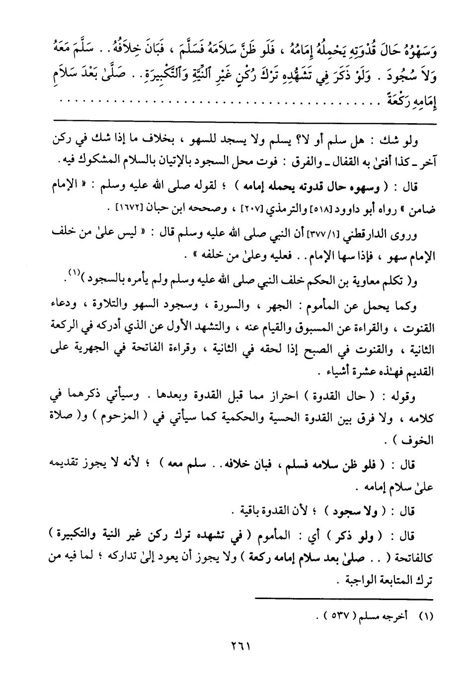 وَسَهْوُهُ حَالَ قُدْوَتِهِ يَحْمِلُهُ إِمَامُهُ، فَلَو ظَنَّ سَلاَمَةُ فَسَلَّمَ، فَبَانَ خِلاَفُهُ .. سَلَّمَ مَعَهُ وَلاَ سُجُودَ. وَلَوْ ذَكَرَ فِي تَشَهُّدِهِ تَرْكَ رُكْنٍ غَيْرِ النِّيَّةِ وَالتَّكْبِيرَةِ .. صَلَّى بَعْدَ سَلاَمِ إِمَامِهِ رَكْعَةً
