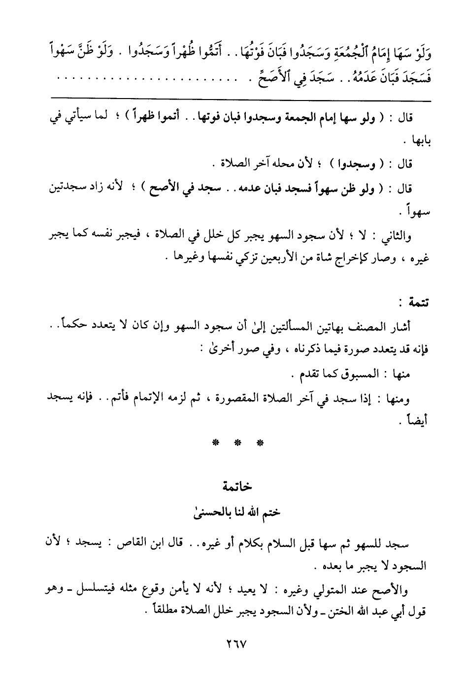سجد للسهو ثم سها قبل السلام بكلام أو غيره .. قال ابن القاص: يسجد؛ لأن السجود لا يجبر ما بعده.