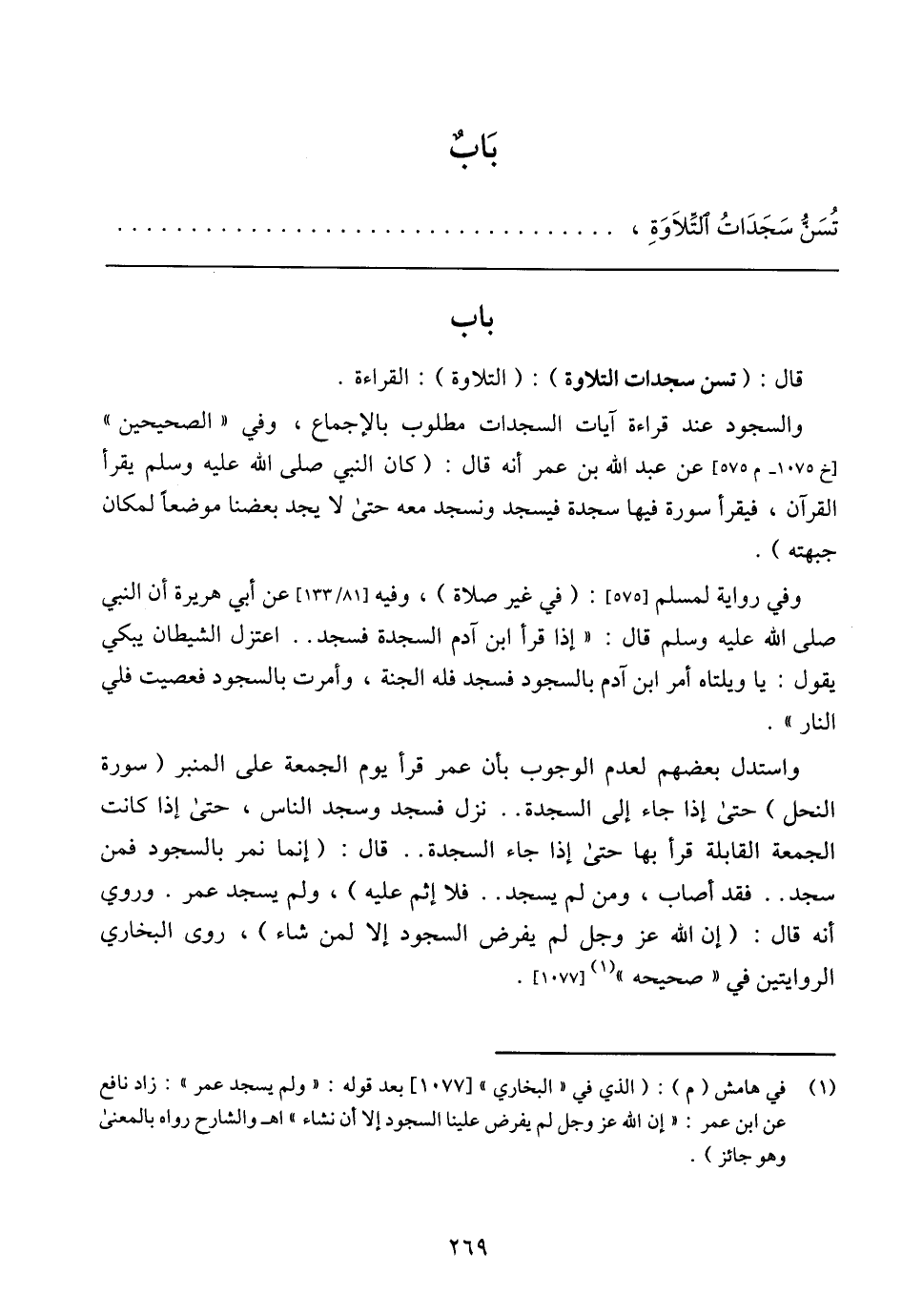 واستدل بعضهم لعدم الوجوب بأن عمر قرأن يوم الجمعة على المنبر (سورة النحل) حتى إذا جاء إلى السجدة .. نزل فسجد وسجد الناس، حتى إذا كانت الجمعة القابلة قرأ بها حتى إذا جاء السجدة .. قال: (إنما نمر بالسجود فمن سجد .. فقد أصاب، ومن لم يسجد .. فلا إثم عليه)، ولم يسجد عمر. وروي أنه قال: (إن الله عز وجل لم يفرض السجود إلا لمن شاء)، روى البخاري الروايتين في (صحيحه) [1077].