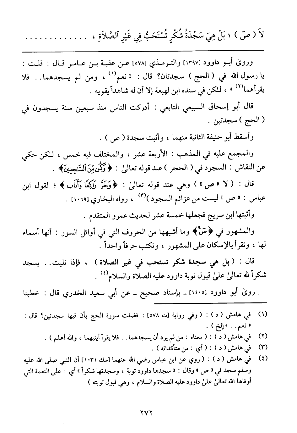 وروى أبو داوود [1397] والترمذي [578] عن عقبة بن عامر قال: قلت: يا رسول الله في (الحج) سجدتان؟ قال: (نعم، ومن لم يسجدهما .. فلا يقرأهما)، لكن في سنده ابن لهيعة إلا أن له شاهدًا يقويه.