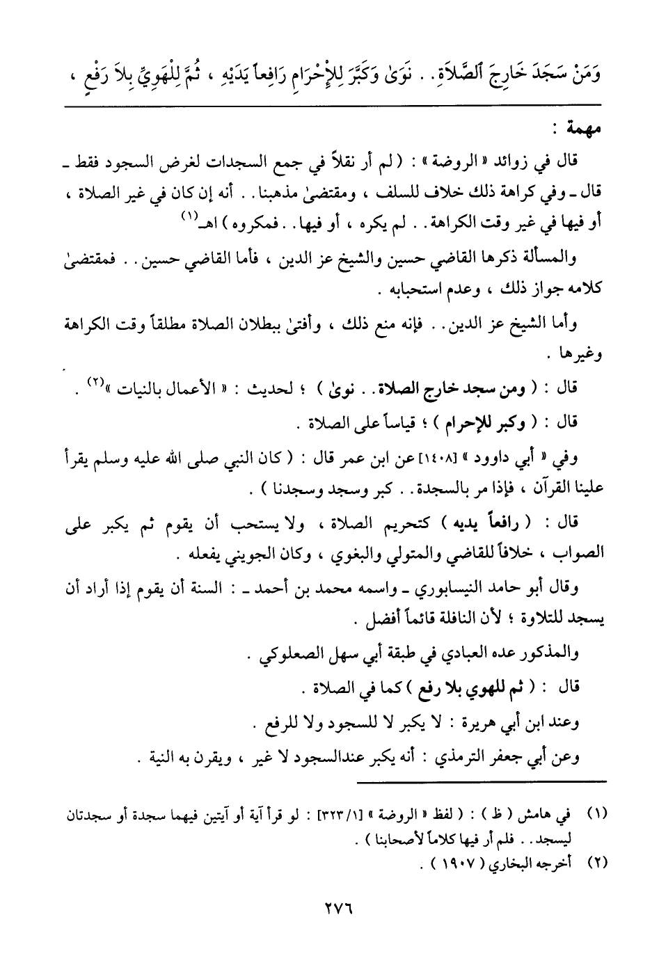 قال في زوائد (الروضة): (لم أر نقلًا في جمع السجدات لغرض السجود فقط- قال- وفي كراهة ذلك خلاف للسلف، ومقتضى مذهبنا .. أنه إن كان في غير الصلاة، أو فيها في غير وقت الكراهة .. لم يكره، أو فيها .. فمكروه) اهـ
