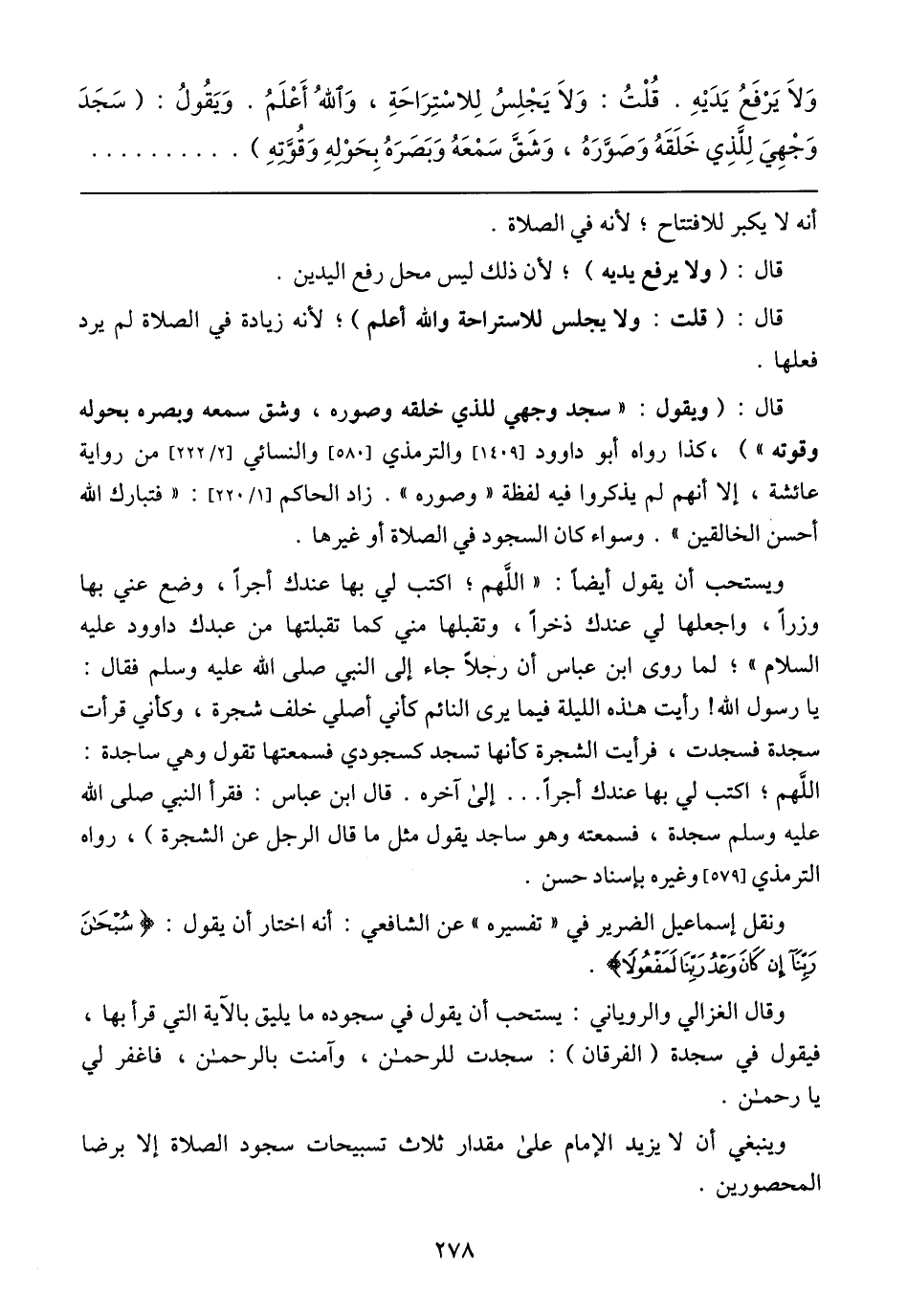 وَلاَ يَرْفَعُ يَدَيْهِ. قُلْتُ: وَلاَ يَجْلِسُ لِلاسْتِرَاحَةِ، وَاللهُ أَعْلَمُ. وَيَقُولُ: (سَجَدَ وَجْهِيَ لِلَّذِي خَلَقَهُ وَصَوَّرَهُ، وَشَقَّ سَمْعَهُ وَبَصَرَهُ بِحَوْلِهِ وَقُوَّتِهِ)