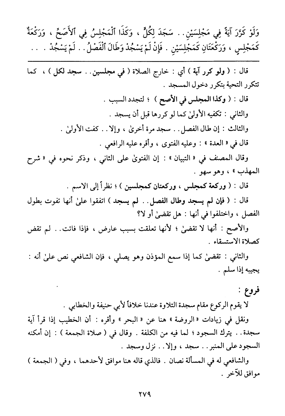 وَلَوْ كَرَّرَ آيَةً فِي مَجْلِسَيْنِ .. سَجَدَ لِكُلٍّ، وَكَذَا الْمَجْلِسُ فِي الأَصَحِّ، وَرَكْعَةٌ كَمَجْلِسٍ، وَرَكْعَتَانِ كَمَجْلِسَيْنِ. فَإِنْ لَمْ يَسْجُدْ وَطَالَ الْفَصْلُ .. لَمْ يَسْجُدْ