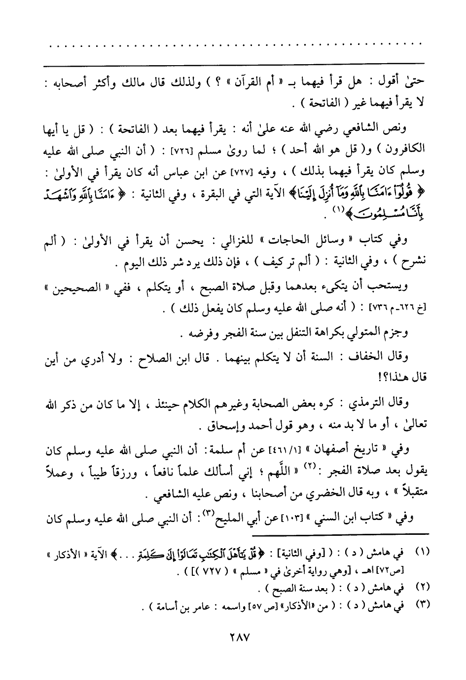 ونص الشافعي رضي الله عنه على أنه: يقرأ فيهما بعد (الفاتحة): (قل يا أيها الكافرون) و (قل هو الله أحد)؛ لما روى مسلم [726]: (أن النبي صلى الله عليه وسلم كان يقرأ فيهما بذلك)، وفيه [727] عن ابن عباس أنه كان يقرأ في الأولى: {قولوا ءامنا بالله وما أنزل إلينا} الآية التي في البقرة، وفي الثانية: {ءامنا بالله واشهد بأنا مسلمون}.