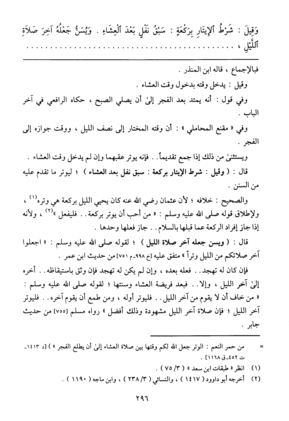 فإن كان له تهجد .. فعله بعده، وإن لم يكن له تهجد فإن وثق باستيقاظه .. أخره إلى آخر الليل، وإلا .. فبعد فريضة العشاء وسنتها؛ لقوله صلى الله عليه وسلم: (من خاف أن لا يقوم من آخر الليل .. فليوتر أوله، ومن طمع أن يقوم آخره .. فليوتر آخر الليل؛ فإن صلاة آخر الليل مشهودة وذلك أفضل) رواه مسلم [755] من حديث جابر.