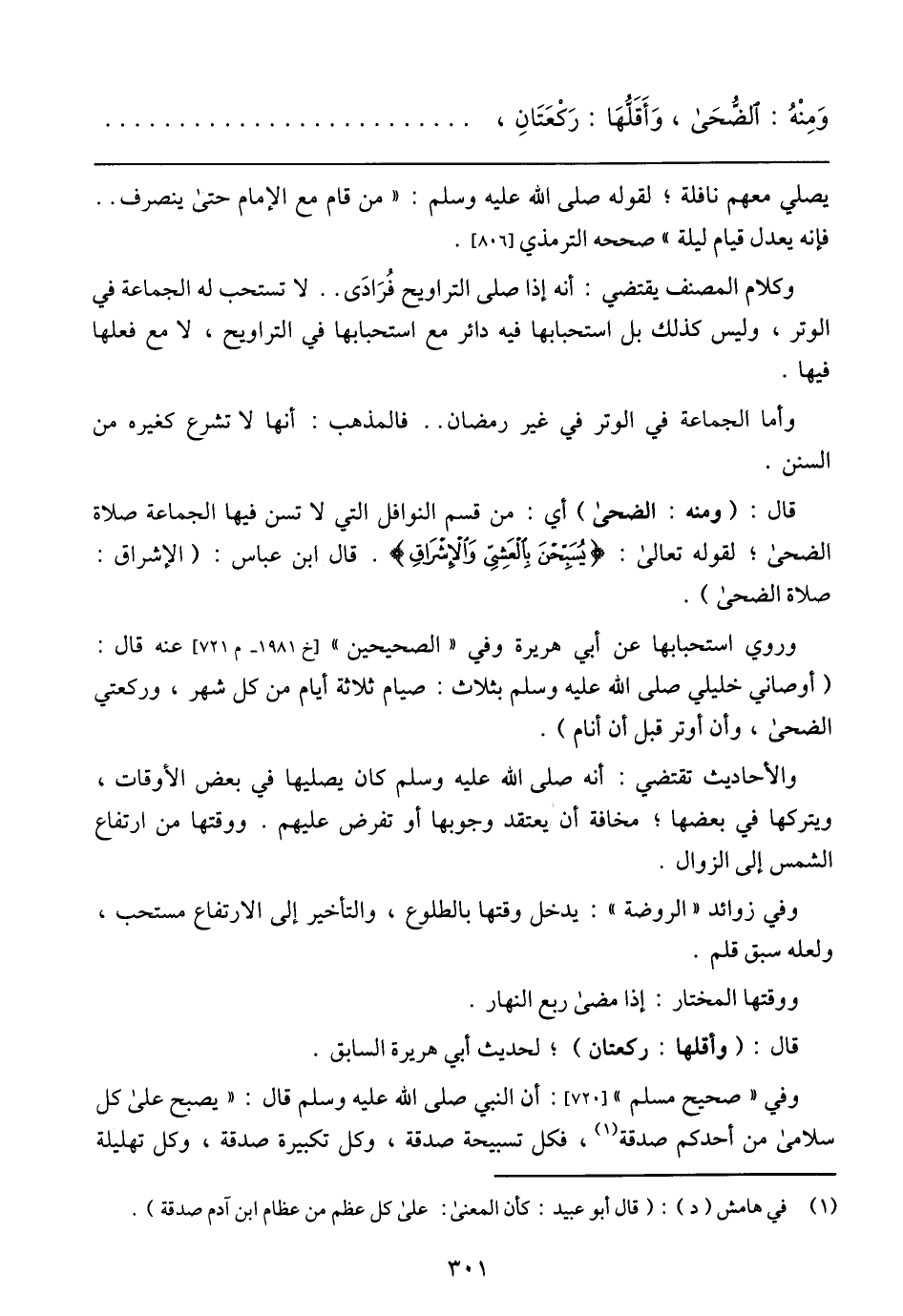 قال: (ومنه: الضحى) أي: من قسم النوافل التي لا تسن فيها الجماعة صلاة الضحى، لقوله تعالى: {يُسَبِّحْنَ بِالْعَشِيِّ والإشْرَاقِ} قال ابن عباس: (الإشراق: صلاة الضحى).