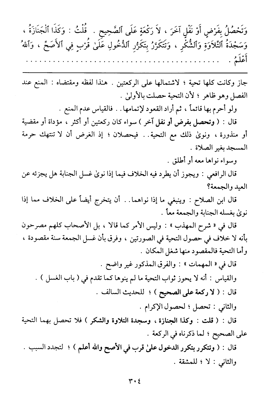 قال في (شرح المهذب): وليس الأمر كما قالا، بل الأصحاب كلهم مصرحون بأنه لا خلافي حصول التحية في الصورتين، وفرق بأن غسل الجمعة سنة مقصودة، وأما التحية فالمقصود منها شغل المكان.